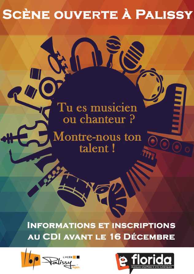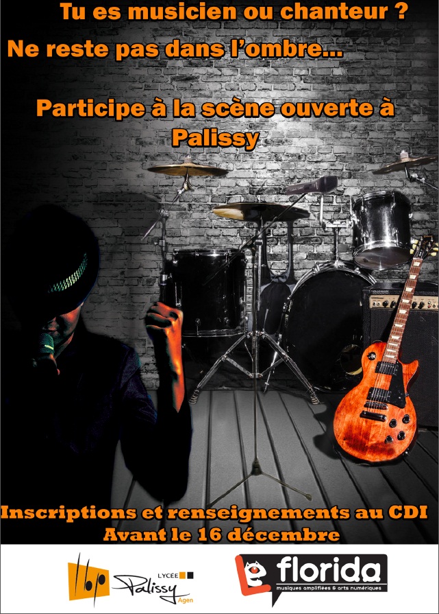 Cette année, les élèves musiciens et/ou chanteurs ont la possibilité de participer à une scène ouverte organisée par le lycée en partenariat avec le Florida. Les élèves souhaitant se produire sur scène doivent s'inscrire au CDI avant le décembre 2016.