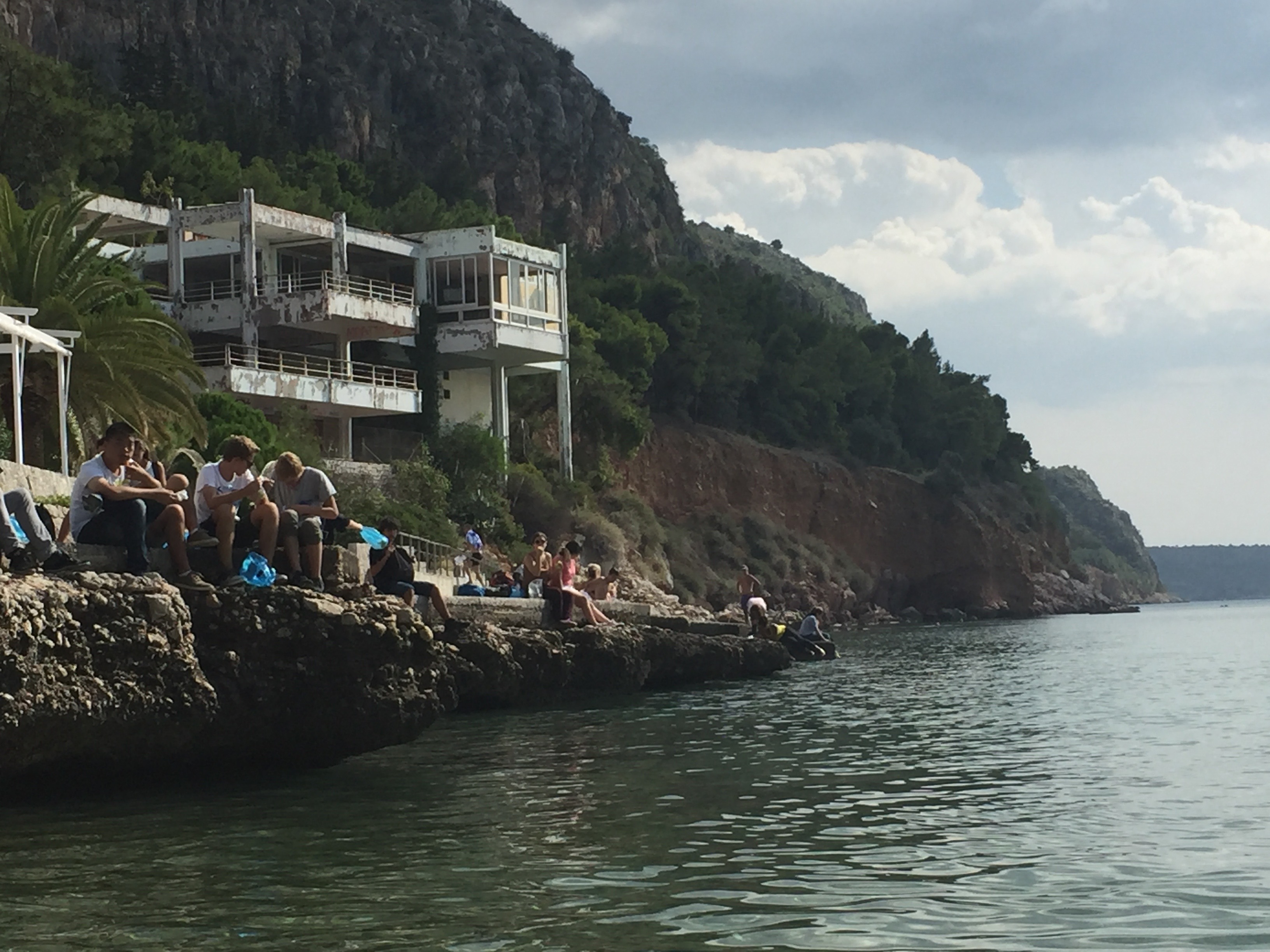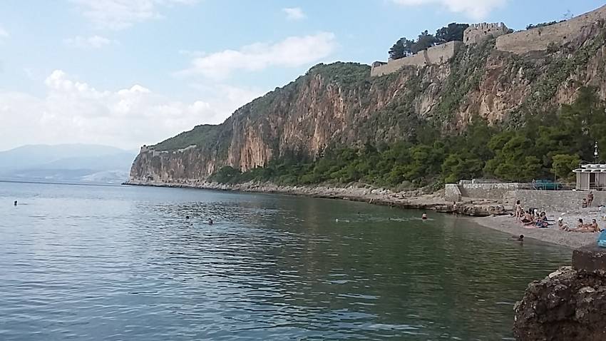 nous sommes allés déjeuner à Nauplie, sur la plage. Nous nous sommes assis au front de mer et avons dégusté notre panier repas composé d'un sandwich copieux et de raisin. Une fois cette ripaille achevée, nous avons laissé l'eau salée nous rafraîchir les pieds. Le cadre était vraiment magnifique bien que la route fût sinueuse. Une plage de galets, de l'eau limpide et des monts verdoyants nous ont déconnectés de la réalité. Puis arriva l'heure fatidique de reprendre notre route pour Épidaure. C'est les yeux émerveillés que nous quittons cette magnifique contrée.