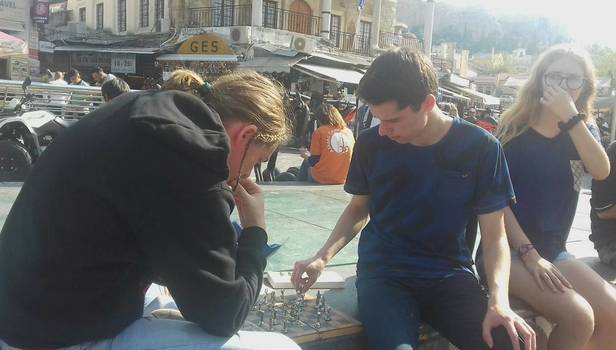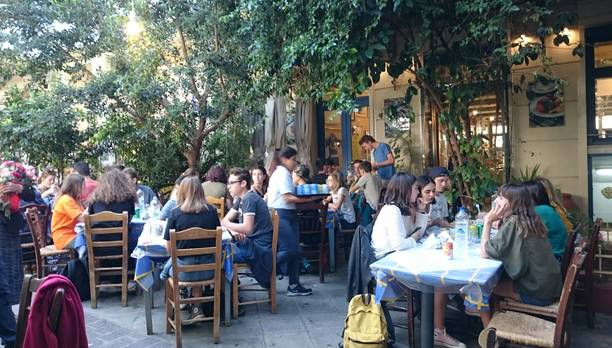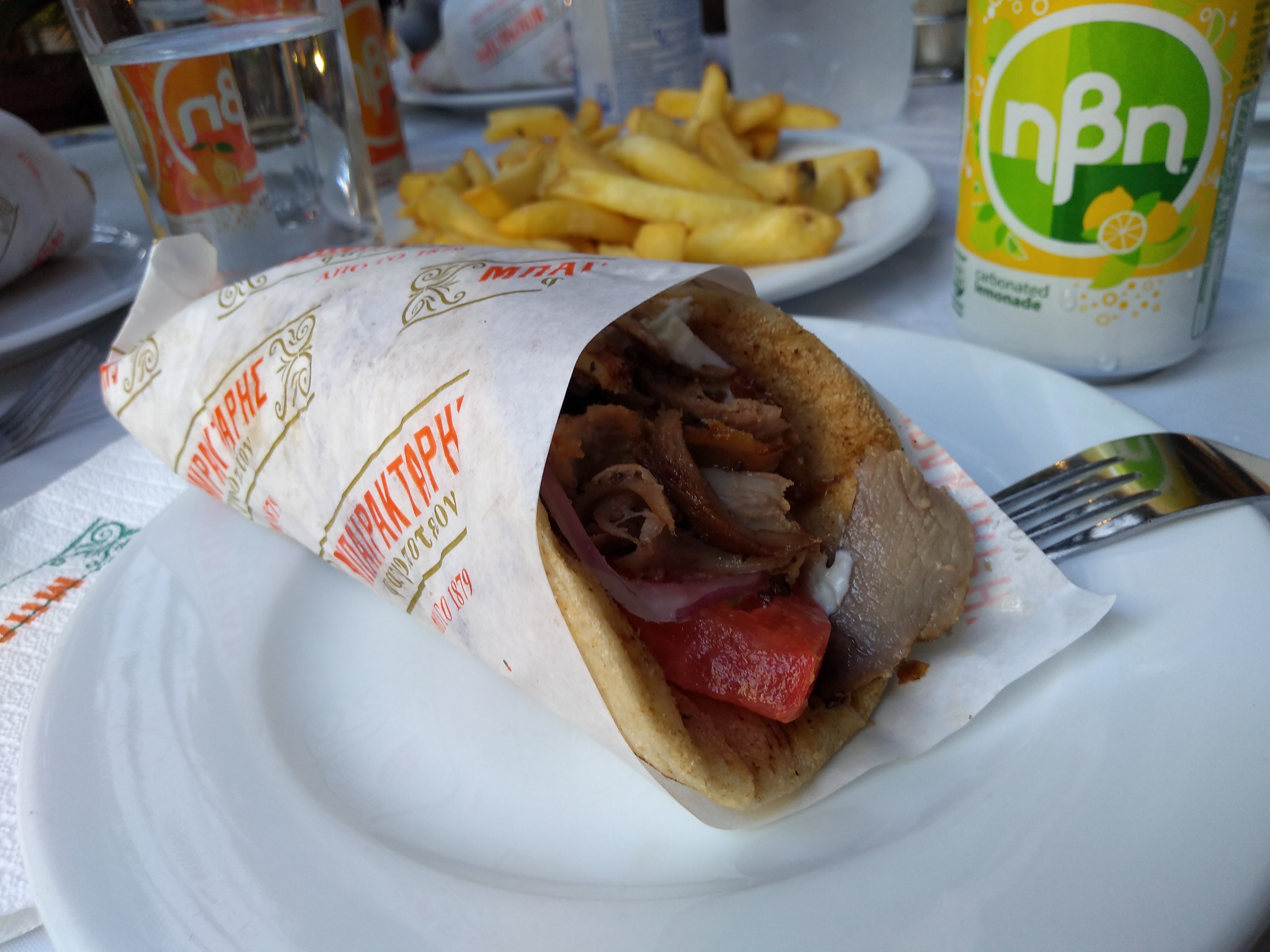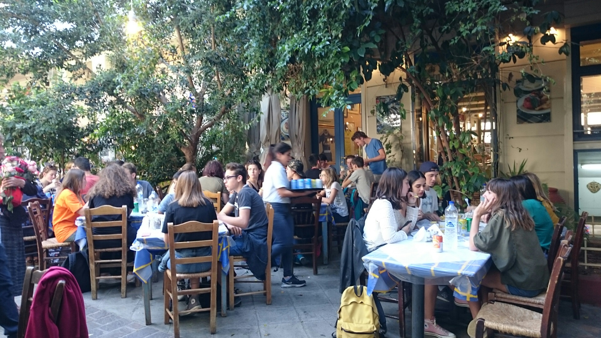Nous nous sommes installés en terrasse dans une petite rue bordée d'arbres qui nous protégaient du soleil méditerrannéen. Le quartier était très vivant et beaucoup de groupes de musique jouaient dans les rues. Il y avait d'ailleurs un groupe installé près de nous. L'ambiance était festive et la nourriture que l'on nous a servie a rendu le moment encore plus agréable : des pitas, garnies de viande, de tomates, persil, oignons et sauce, le tout accompagné de frites. Tout se mange à la main, l'ambiance en devient encore plus chaleureuse ! Ça serait apparemment le déjeuner typique des grecs. C'était délicieux au point que certains en ont repris ! Après ce déjeuner copieux, nous avons eu une heure et demi de libre afin de profiter des boutiques alentours.